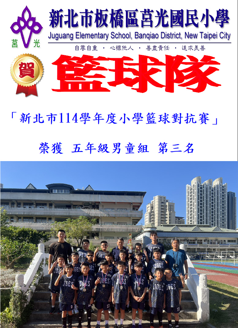 恭喜籃球隊參加新北市114學年度國小籃球對抗賽 榮獲五年級男童組 第三名