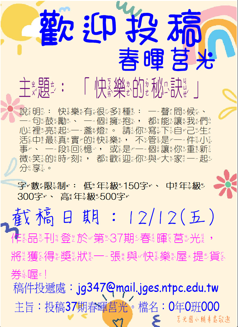 作品榮獲刊登者將發快樂屋提貨券乙張與獎狀一張。請老師鼓勵學生多多投稿~
