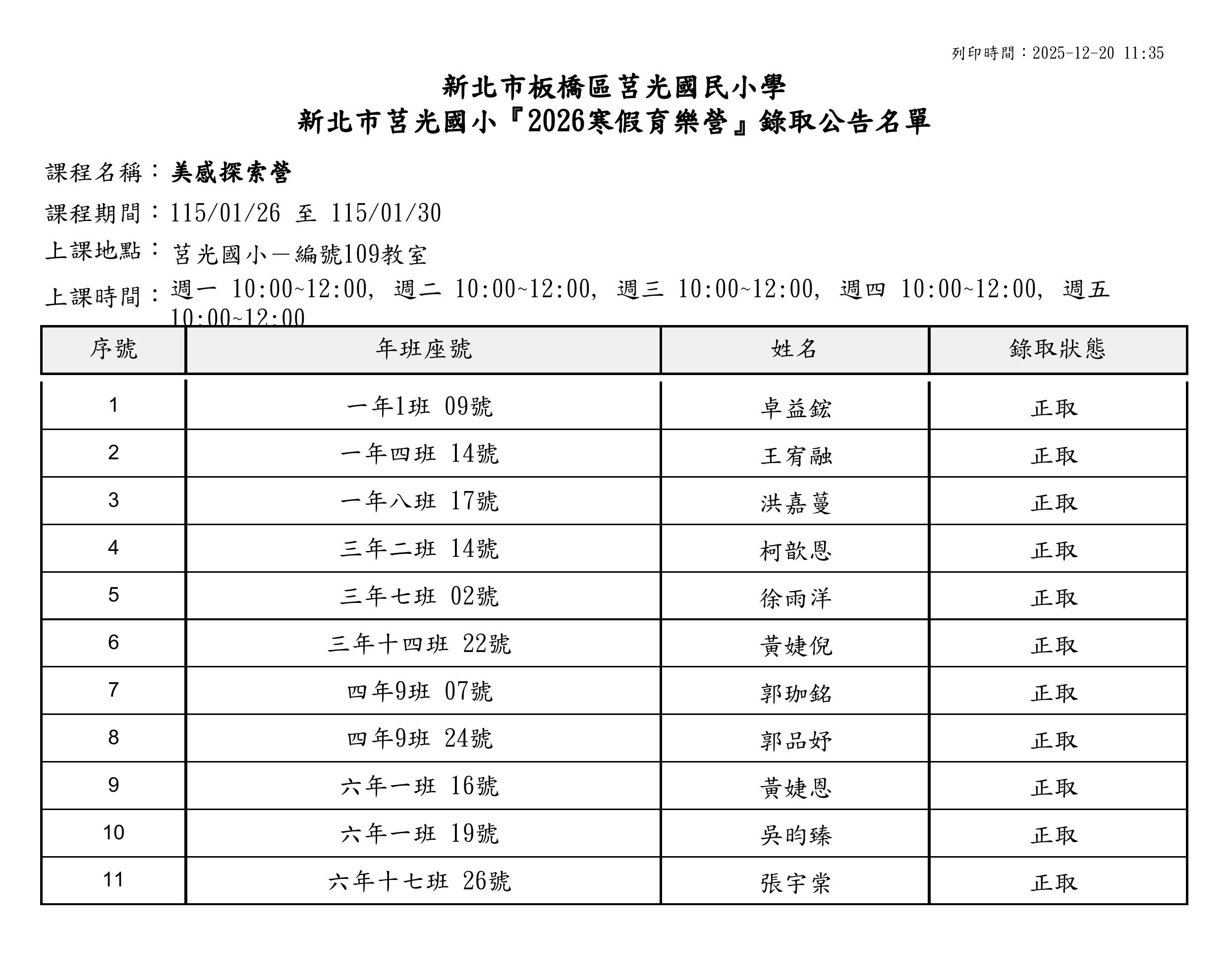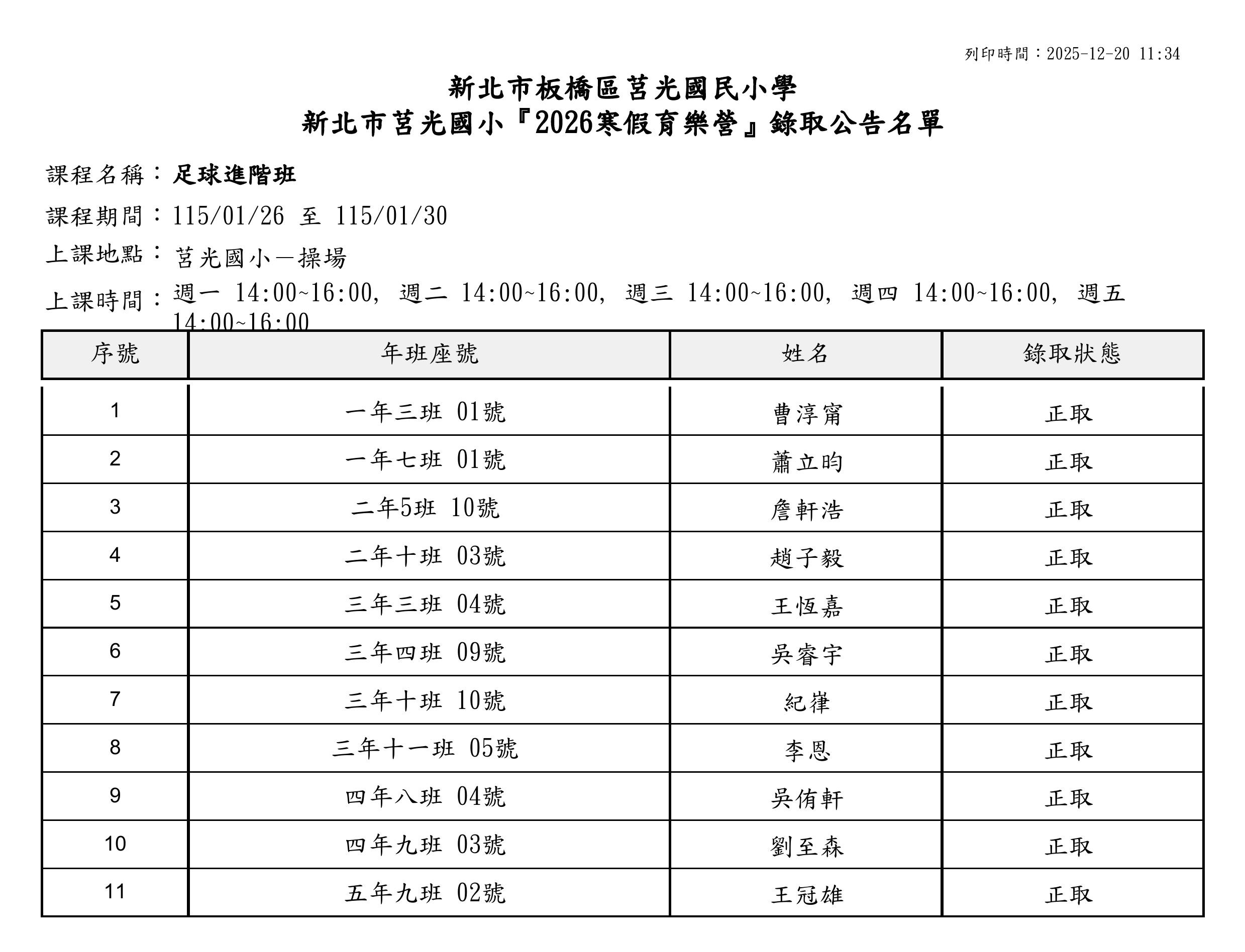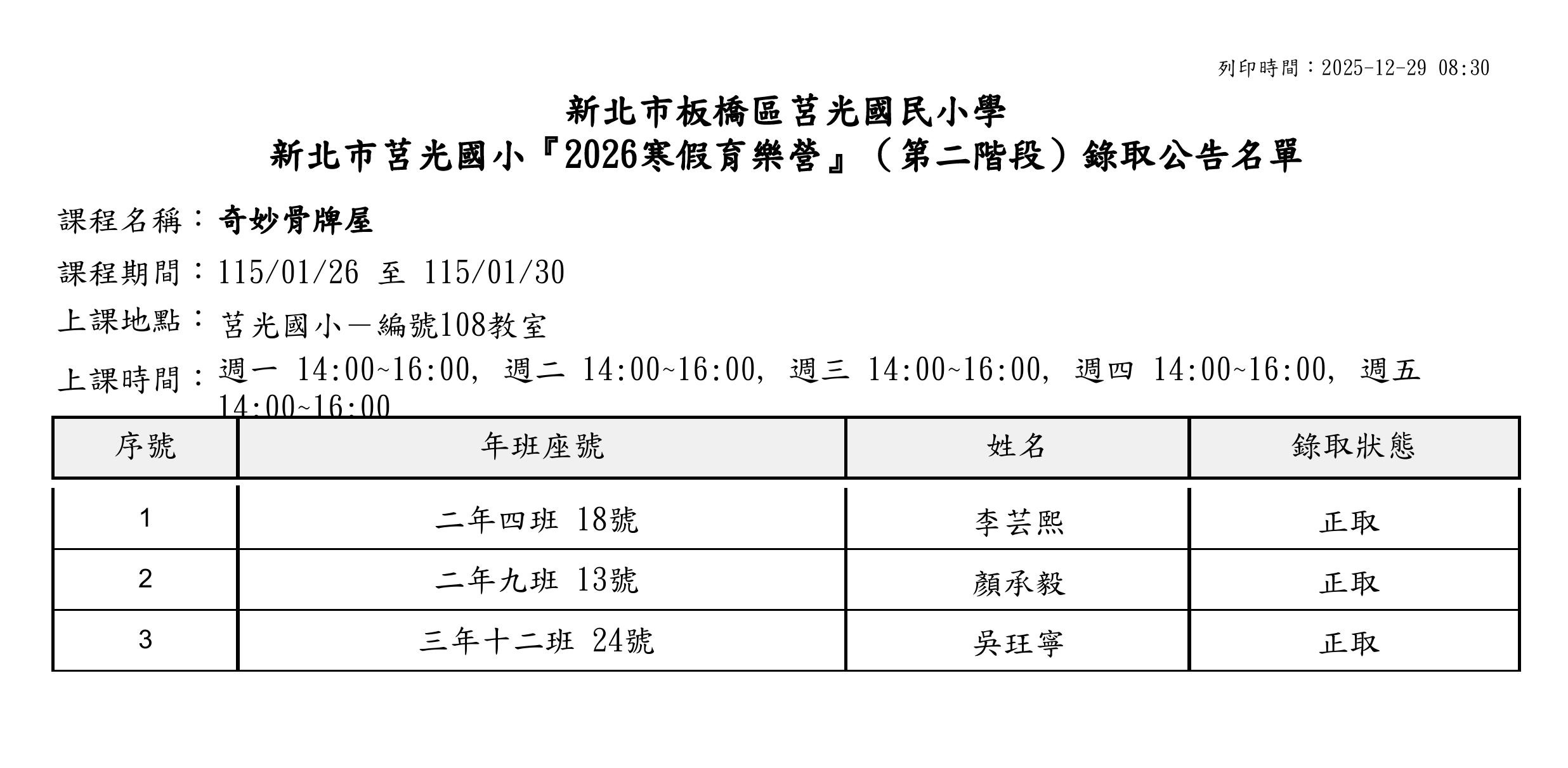 本校2026寒假育樂營第二階段錄取名單