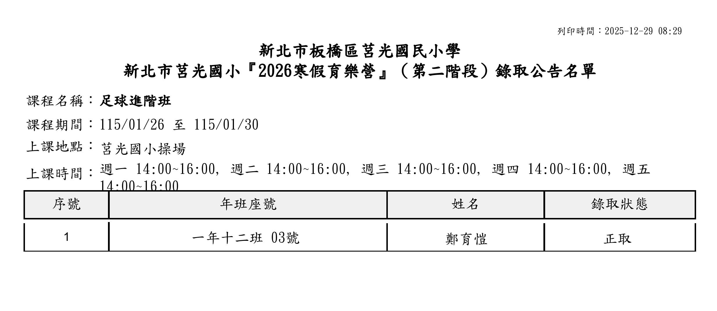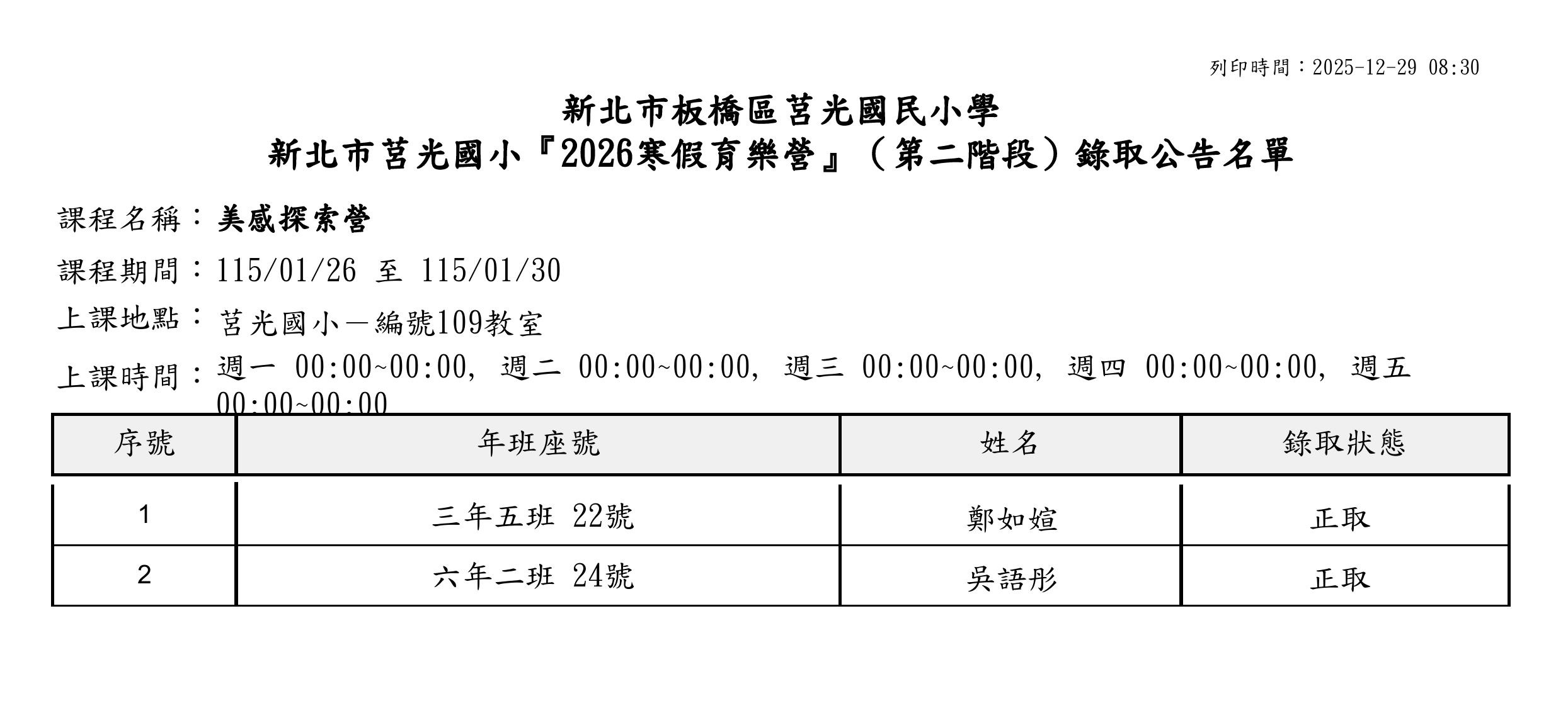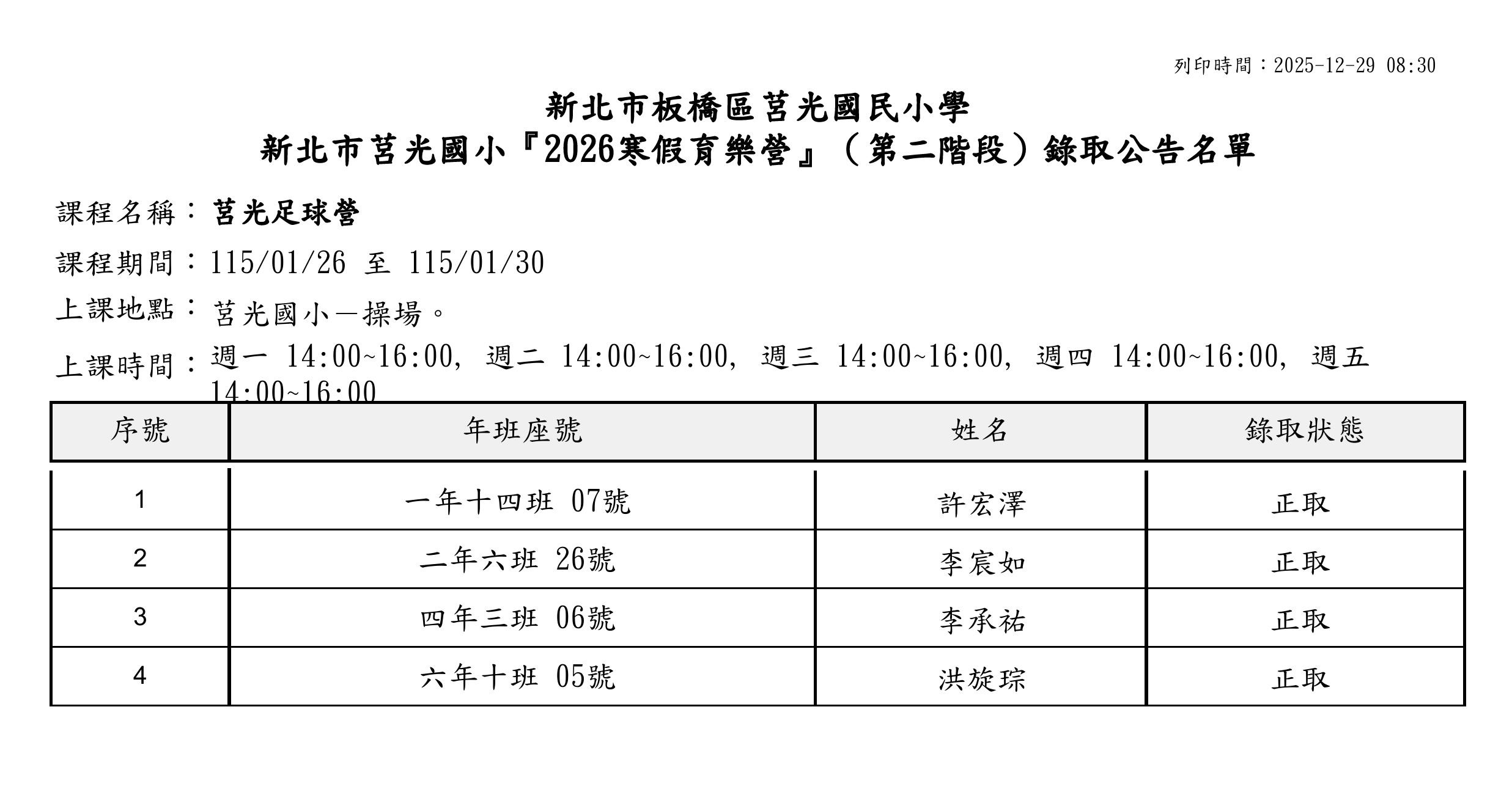 本校2026寒假育樂營第二階段錄取名單