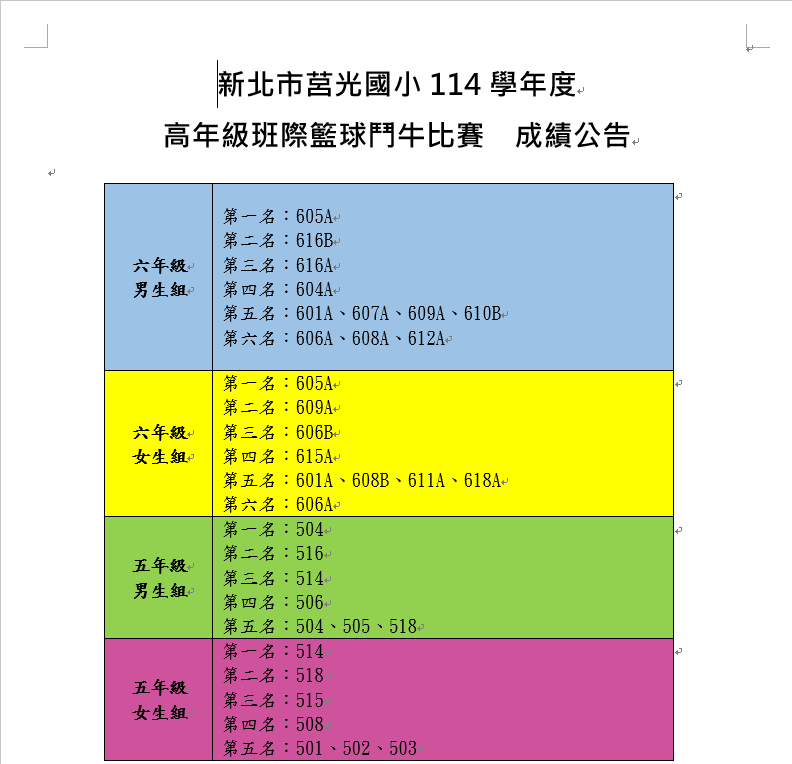 114學年度莒光國小高年級鬥牛比賽成績一覽表